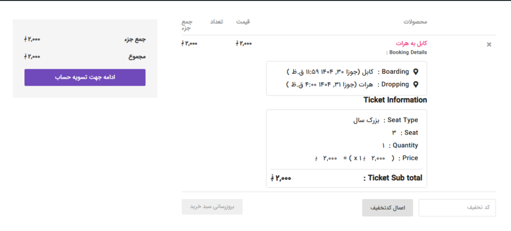 6- بعد از مشاهده جزئیات سفرتان روی دکمه تسویه حساب کلیک نمائید