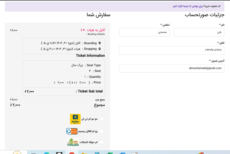 7- سپس نام ، تخلص ، شماره تماس و ایمل برای ارسال تکت خانه پوری نمائید.