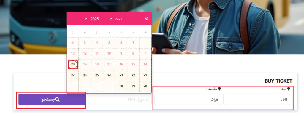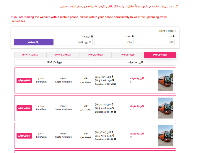 2- بعد از زدن دکمه جستجو بس ، نوعیت بس تان را انتخاب کرده و روی دکمه نمایش چوکی کلیک کنید .